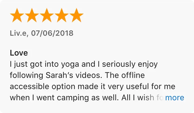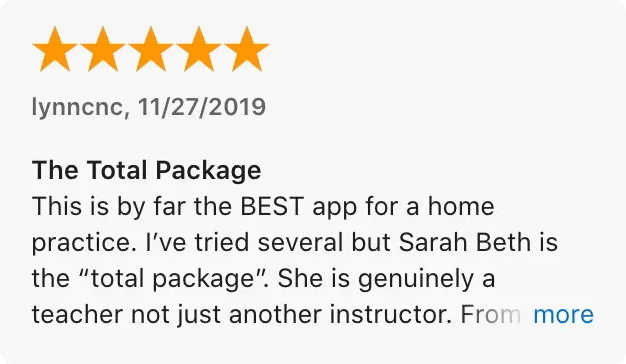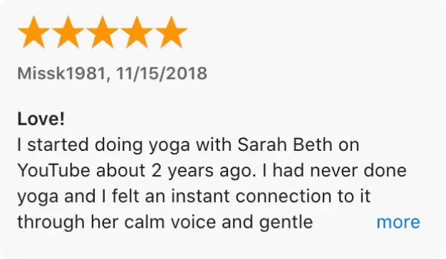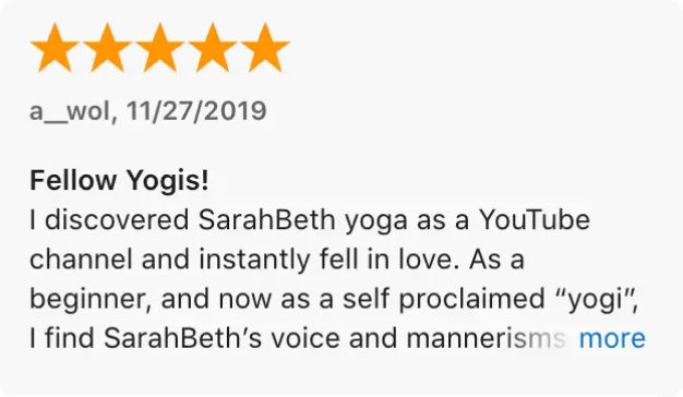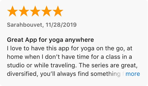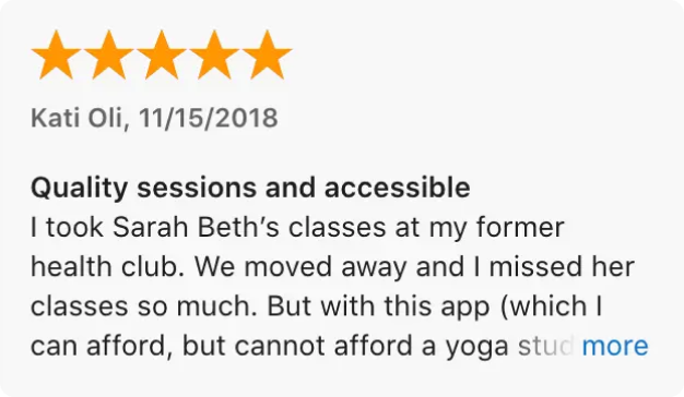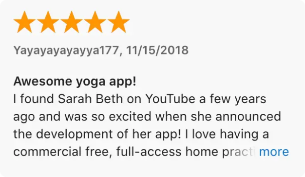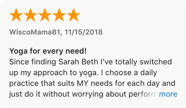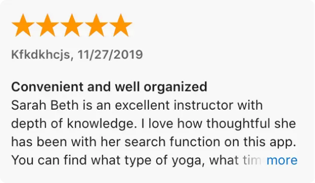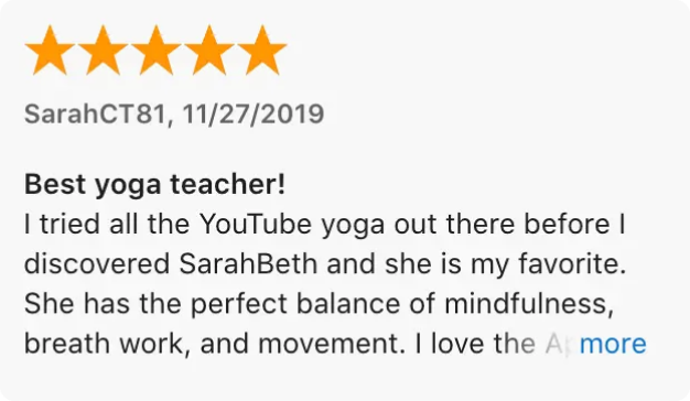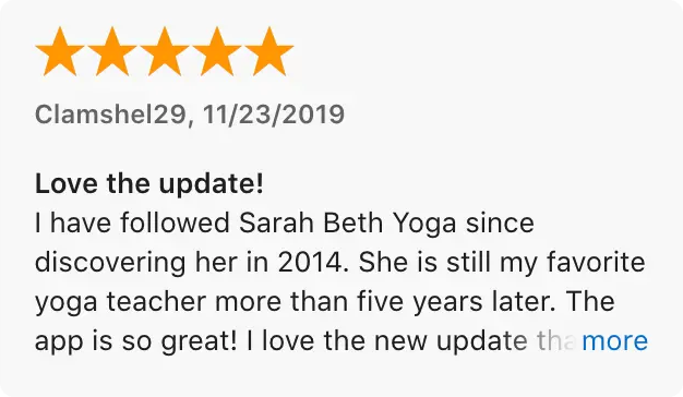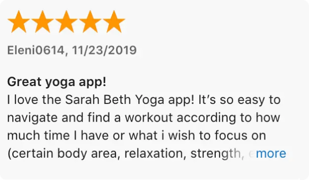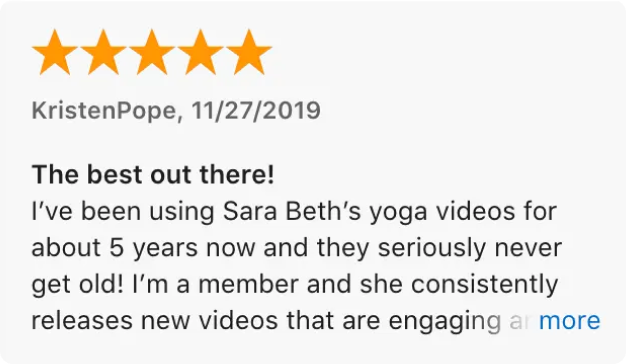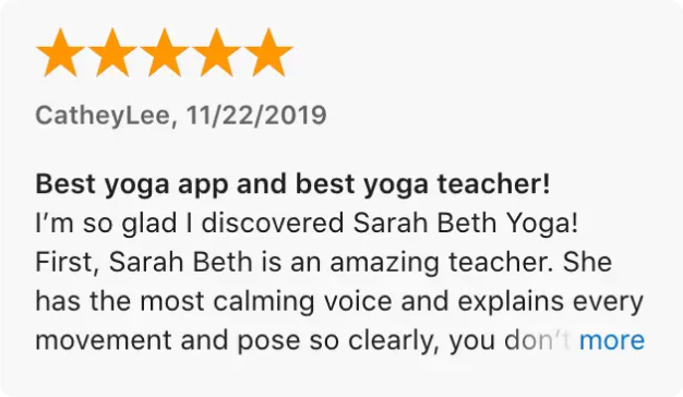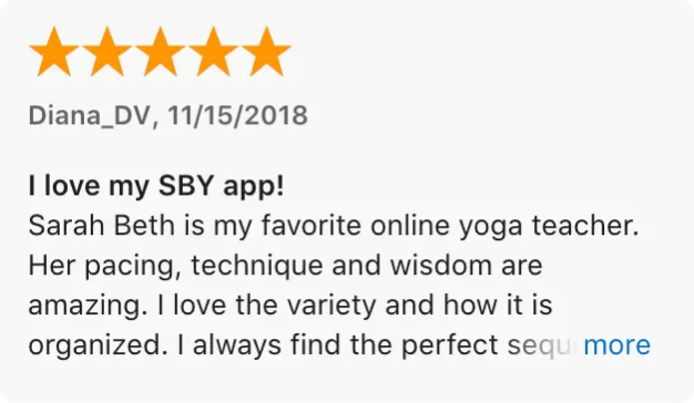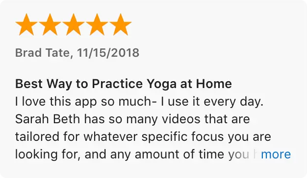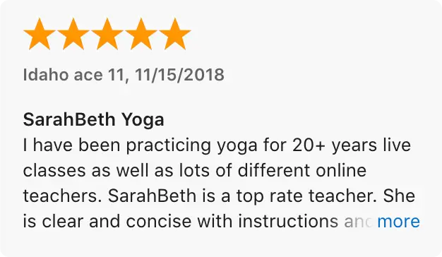 Your membership gets you unlimited access to the SarahBethYoga Member Portal on desktop and the SarahBethYoga APP (iOS, Android, Roku, FireTV & Apple TV) to stream ad-free, download offline, and browse by style, focus, level & length.