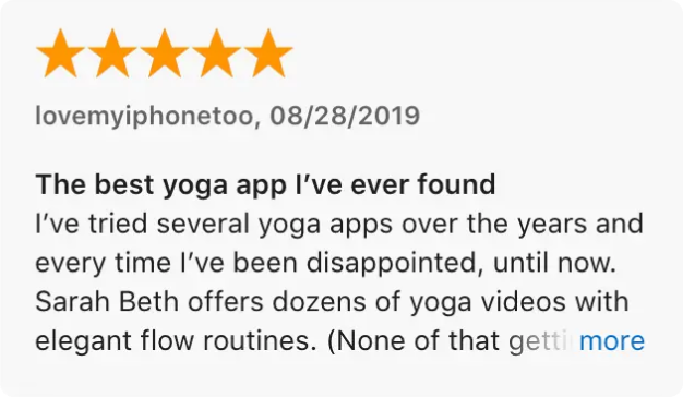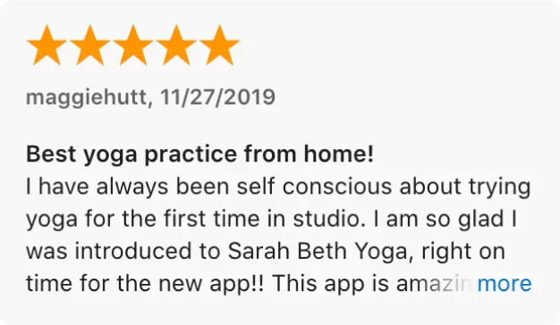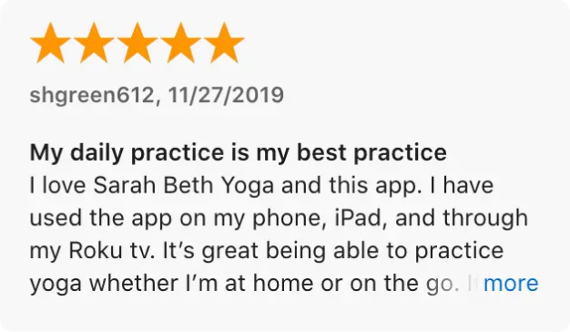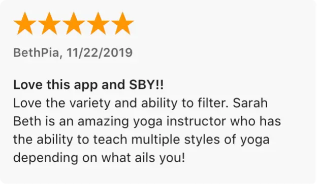 - THE APPS: Your membership gets you unlimited access to the SarahBethYoga APP (iOS, Android, Roku, FireTV & Apple TV) to stream ad-free, download offline and browse by style, focus, level & length.