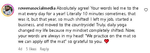 Your words led me to the mat every day for a year! ... changed my life because my mindset completely shifted. Now, your words are always in my head! "We practice on the mat so we can apply off the mat" so grateful to you. ❤️.