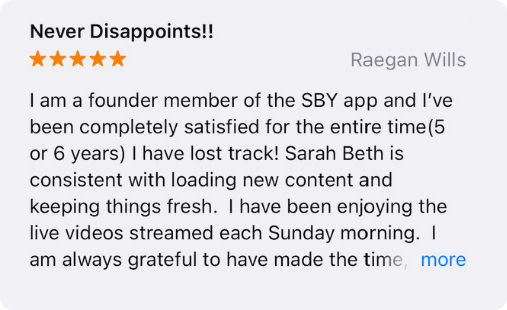 SarahBethYoga App users are all welcome to join our lively SBY Community, a supportive, passionate, and growth-focused group.